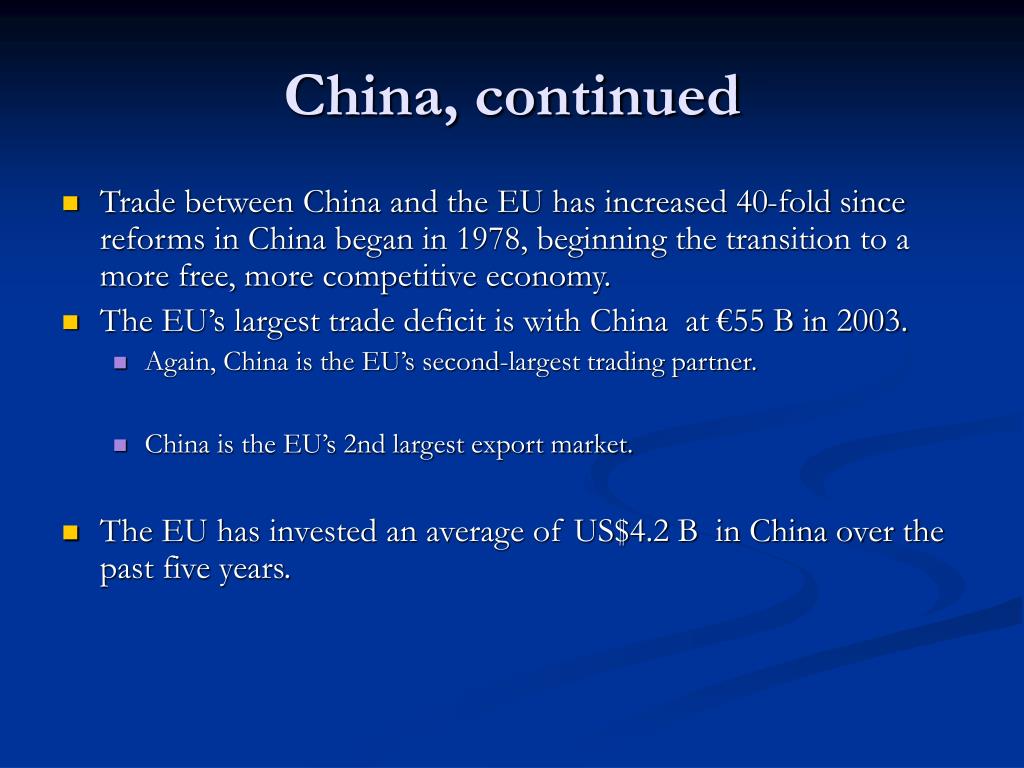 China, continued • Trade between China and the EU has increased 40-fold since reforms in China began in 1978, beginning the transition to a more free, more competitive economy. • The EU’s largest trade deficit is with China at €55 B in 2003. • Again, China is the EU’s second-largest trading partner. • China is the EU’s 2nd largest export market. • The EU has invested an average of US$4.2 B in China over the past five years.