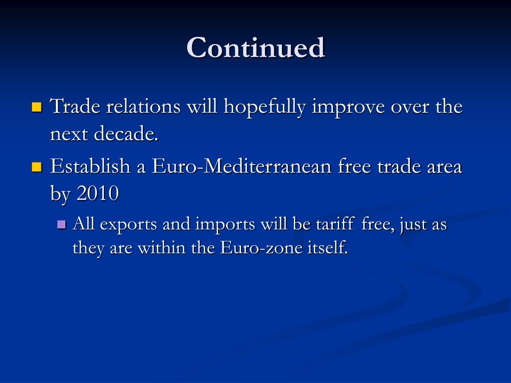 Continued • Trade relations will hopefully improve over the next decade. • Establish a Euro-Mediterranean free trade area by 2010 • All exports and imports will be tariff free, just as they are within the Euro-zone itself.