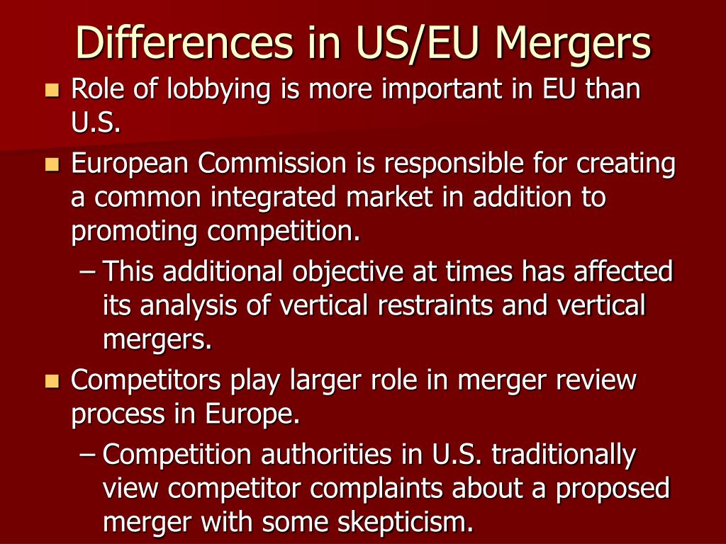 Differences in US/EU Mergers • Role of lobbying is more important in EU than U.S. • European Commission is responsible for creating a common integrated market in addition to promoting competition. • This additional objective at times has affected its analysis of vertical restraints and vertical mergers. • Competitors play larger role in merger review process in Europe. • Competition authorities in U.S. traditionally view competitor complaints about a proposed merger with some skepticism.
