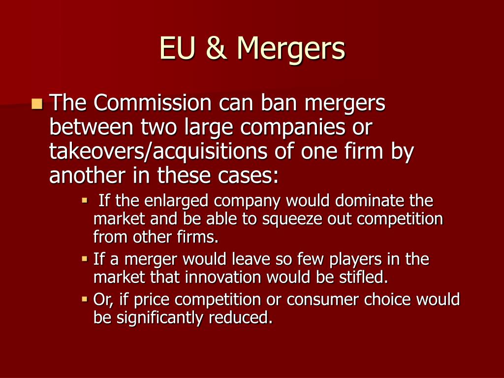 EU & Mergers • The Commission can ban mergers between two large companies or takeovers/acquisitions of one firm by another in these cases: • If the enlarged company would dominate the market and be able to squeeze out competition from other firms. • If a merger would leave so few players in the market that innovation would be stifled. • Or, if price competition or consumer choice would be significantly reduced.