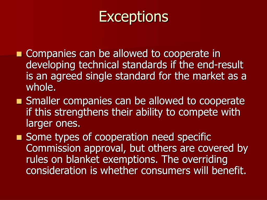 Exceptions • Companies can be allowed to cooperate in developing technical standards if the end-result is an agreed single standard for the market as a whole. • Smaller companies can be allowed to cooperate if this strengthens their ability to compete with larger ones. • Some types of cooperation need specific Commission approval, but others are covered by rules on blanket exemptions. The overriding consideration is whether consumers will benefit.