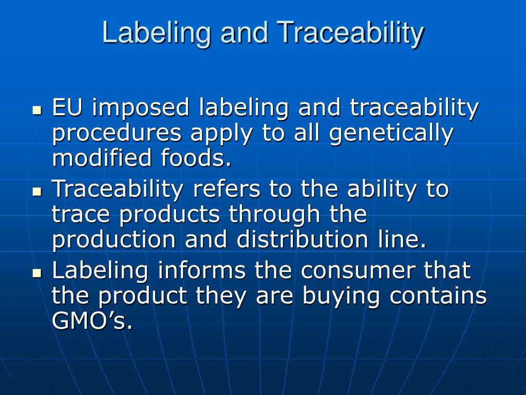 Labeling and Traceability • EU imposed labeling and traceability procedures apply to all genetically modified foods. • Traceability refers to the ability to trace products through the production and distribution line. • Labeling informs the consumer that the product they are buying contains GMO’s.