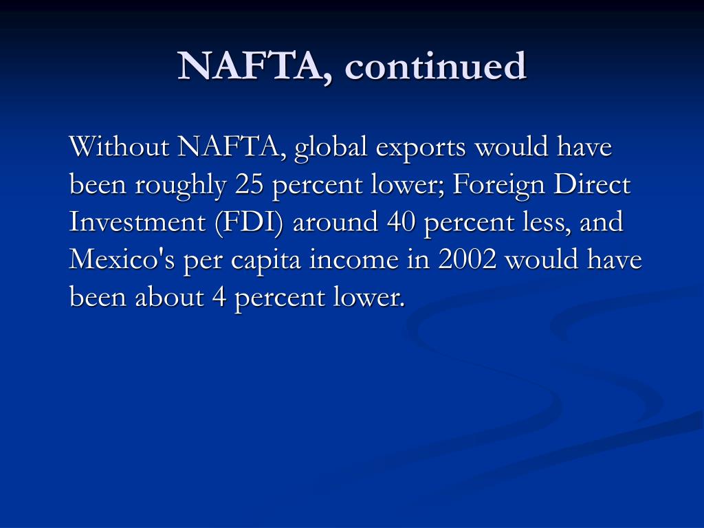 NAFTA, continued Without NAFTA, global exports would have been roughly 25 percent lower; Foreign Direct Investment (FDI) around 40 percent less, and Mexico's per capita income in 2002 would have been about 4 percent lower.