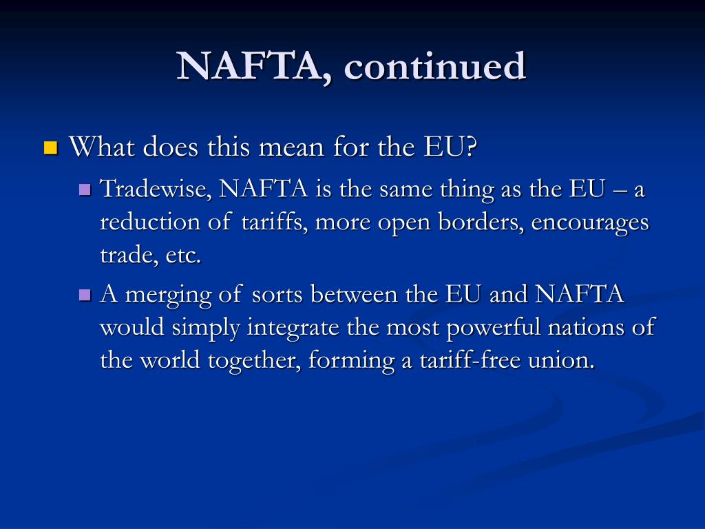 NAFTA, continued • What does this mean for the EU? • Tradewise, NAFTA is the same thing as the EU – a reduction of tariffs, more open borders, encourages trade, etc. • A merging of sorts between the EU and NAFTA would simply integrate the most powerful nations of the world together, forming a tariff-free union.