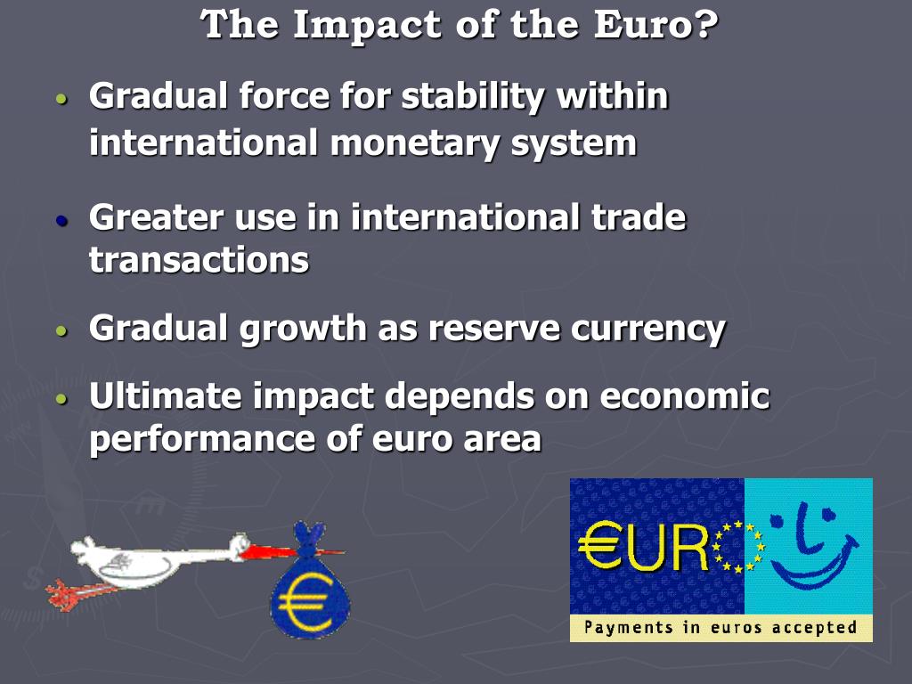 The Impact of the Euro? • Gradual force for stability within international monetary system • Greater use in international trade transactions • Gradual growth as reserve currency • Ultimate impact depends on economic performance of euro area