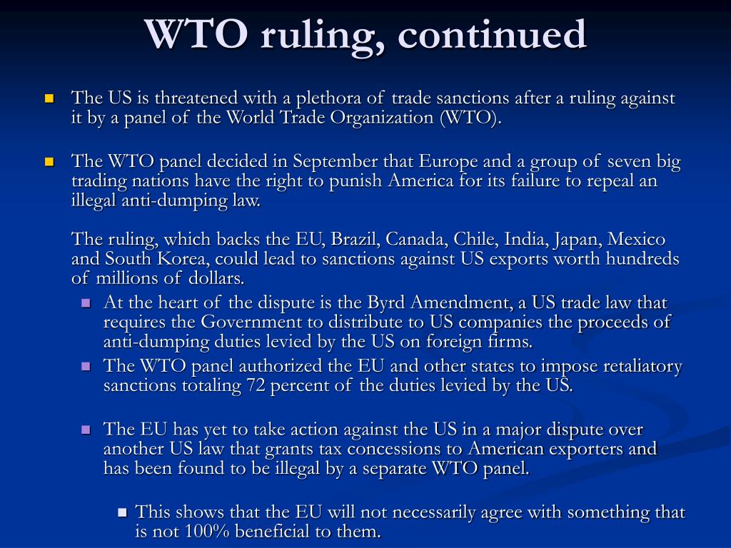 WTO ruling, continued • The US is threatened with a plethora of trade sanctions after a ruling against it by a panel of the World Trade Organization (WTO). • The WTO panel decided in September that Europe and a group of seven big trading nations have the right to punish America for its failure to repeal an illegal anti-dumping law.The ruling, which backs the EU, Brazil, Canada, Chile, India, Japan, Mexico and South Korea, could lead to sanctions against US exports worth hundreds of millions of dollars. • At the heart of the dispute is the Byrd Amendment, a US trade law that requires the Government to distribute to US companies the proceeds of anti-dumping duties levied by the US on foreign firms. • The WTO panel authorized the EU and other states to impose retaliatory sanctions totaling 72 percent of the duties levied by the US. • The EU has yet to take action against the US in a major dispute over another US law that grants tax concessions to American exporters and has been found to be illegal by a separate WTO panel. • This shows that the EU will not necessarily agree with something that is not 100% beneficial to them.