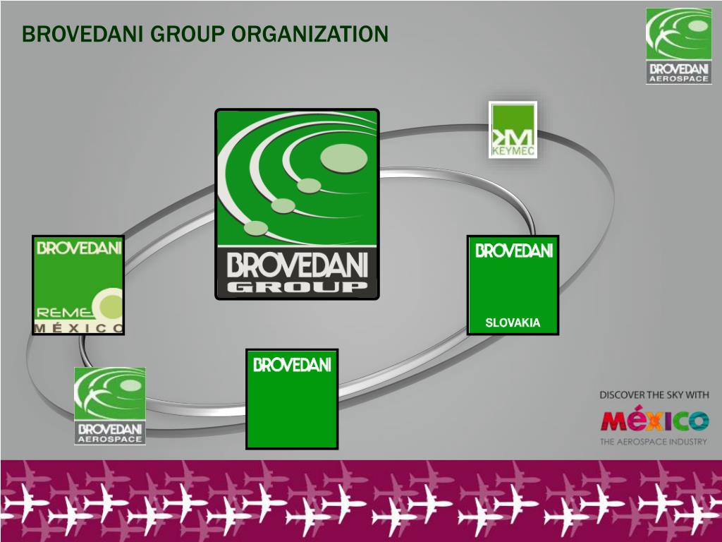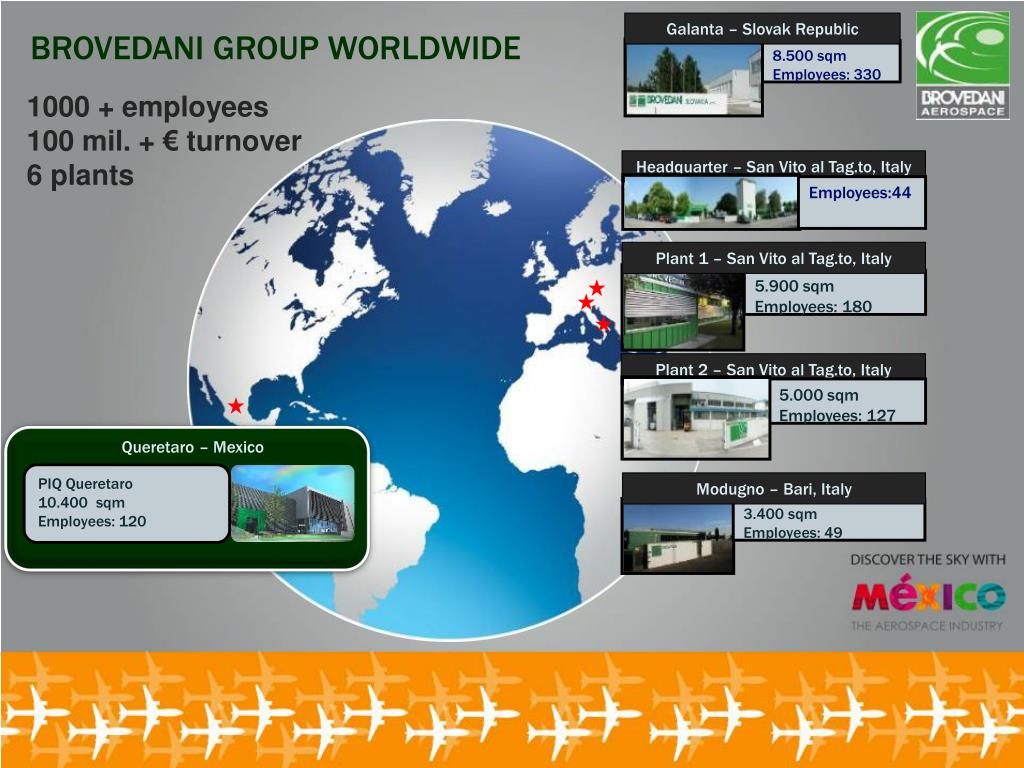 BROVEDANI REME MEXICO. BROVEDANI REME MÉXICO BROVEDANI AEROSPACE. BROVEDANI GROUP ORGANIZATION. Galanta – Slovak Republic. BROVEDANI GROUP WORLDWIDE. 8.500 sqm Employees: 330. 1000 + employees 100 mil. + € turnover 6 plants. Headquarter – San Vito al Tag.to, Italy. Employees:44.
