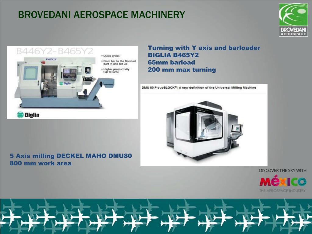 BROVEDANI AEROSPACE MACHINERY Turning with Y axis and barloader BIGLIA B465Y2 65mm barload 200 mm max turning 5 Axis milling DECKEL MAHO DMU80 800 mm work area
