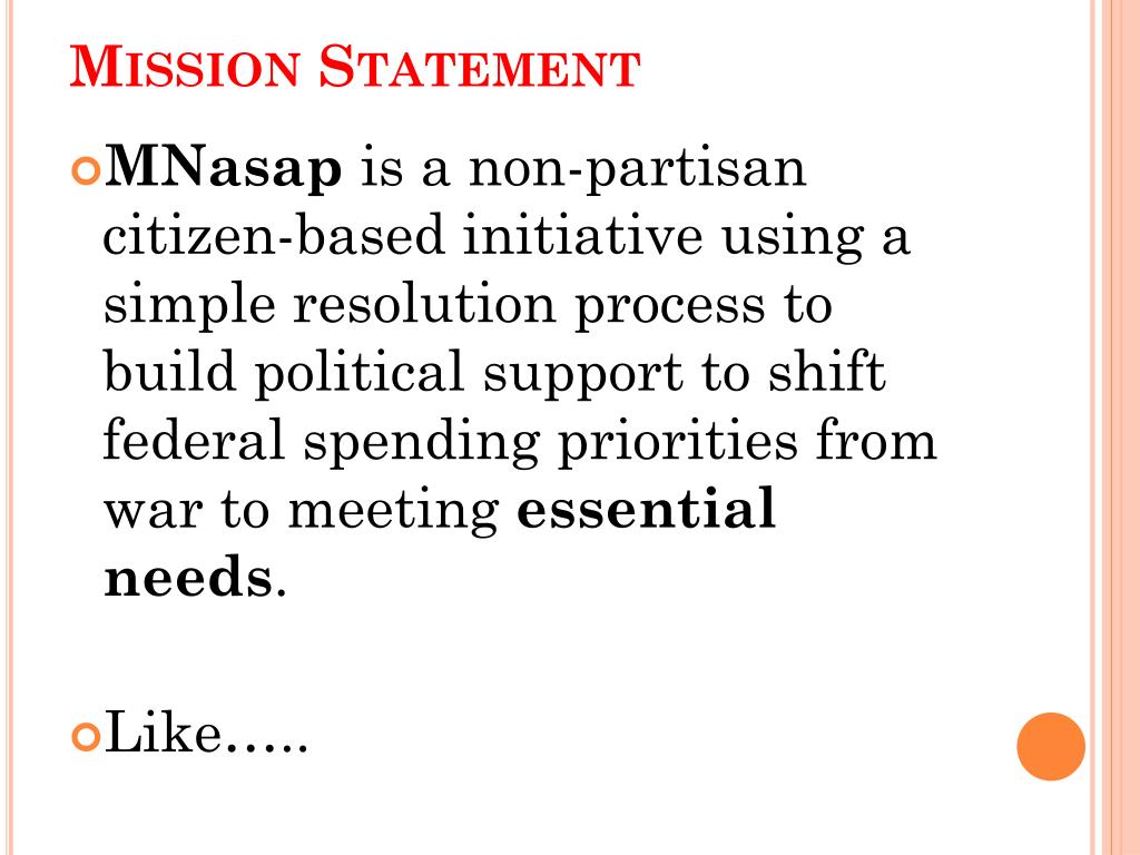 Mission Statement • MNasap is a non-partisan citizen-based initiative using a simple resolution process to build political support to shift federal spending priorities from war to meeting essential needs. • Like…..