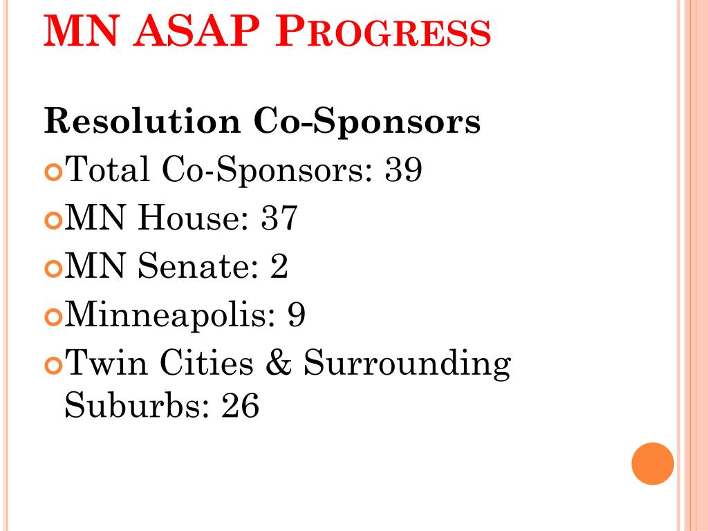 MN ASAP Progress Resolution Co-Sponsors • Total Co-Sponsors: 39 • MN House: 37 • MN Senate: 2 • Minneapolis: 9 • Twin Cities & Surrounding Suburbs: 26