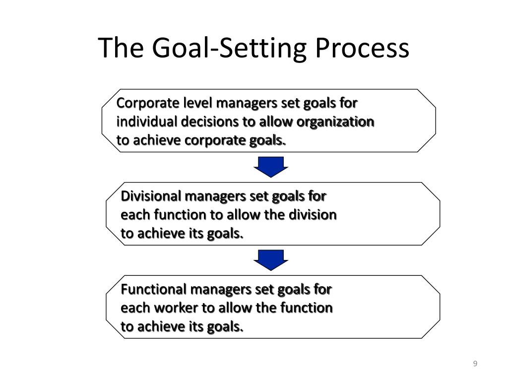 The Goal-Setting Process Corporate level managers set goals for individual decisions to allow organization to achieve corporate goals. Divisional managers set goals for each function to allow the division to achieve its goals. Functional managers set goals for each worker to allow the function to achieve its goals.