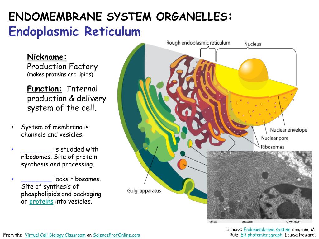 ENDOMEMBRANE SYSTEM ORGANELLES: Endoplasmic Reticulum • Nickname: • Production Factory (makes proteins and lipids) • Function: Internal production & delivery system of the cell. • System of membranous channels and vesicles. • ________ is studded with ribosomes. Site of protein synthesis and processing. • ________ lacks ribosomes. Site of synthesis of phospholipids and packaging of proteins into vesicles. Images: Endomembrane system diagram, M. Ruiz, ER photomicrograph, Louisa Howard. From the Virtual Cell Biology Classroom on ScienceProfOnline.com