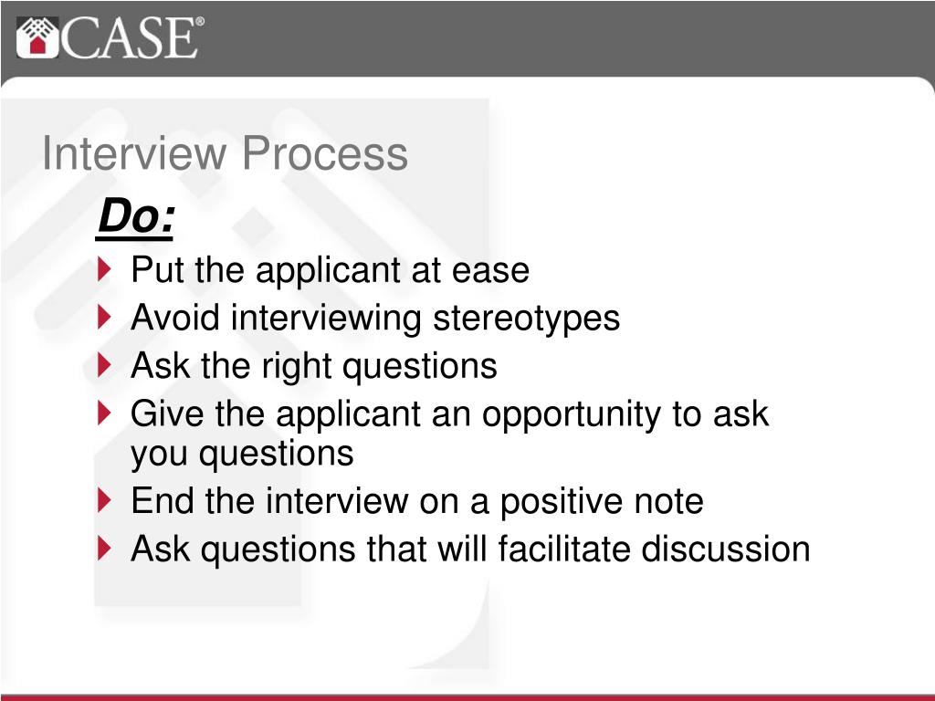 Interview Process Do: • Put the applicant at ease • Avoid interviewing stereotypes • Ask the right questions • Give the applicant an opportunity to ask you questions • End the interview on a positive note • Ask questions that will facilitate discussion