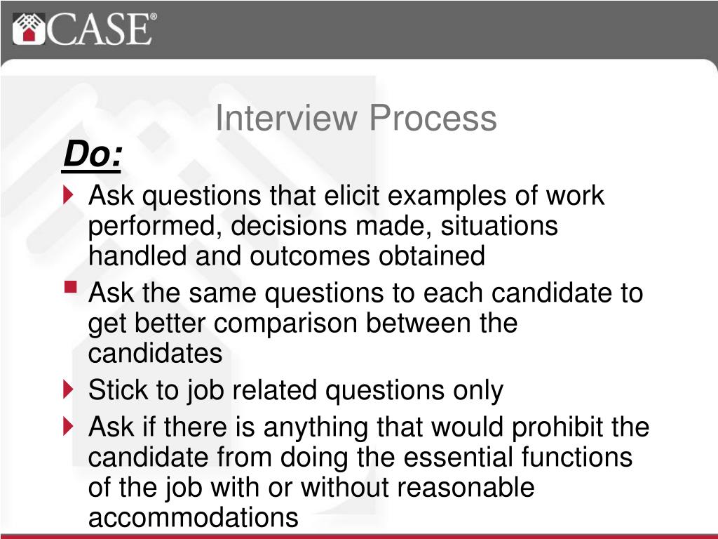 Interview Process Do: • Ask questions that elicit examples of work performed, decisions made, situations handled and outcomes obtained • Ask the same questions to each candidate to get better comparison between the candidates • Stick to job related questions only • Ask if there is anything that would prohibit the candidate from doing the essential functions of the job with or without reasonable accommodations