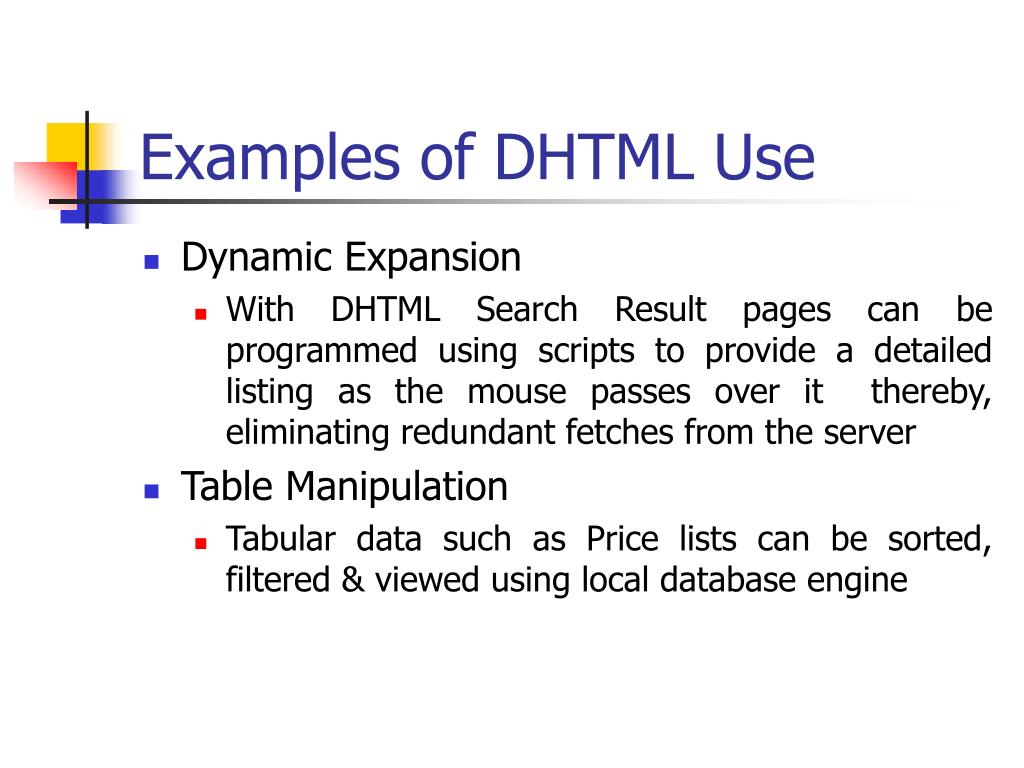 Examples of DHTML Use • Dynamic Expansion • With DHTML Search Result pages can be programmed using scripts to provide a detailed listing as the mouse passes over it thereby, eliminating redundant fetches from the server • Table Manipulation • Tabular data such as Price lists can be sorted, filtered & viewed using local database engine