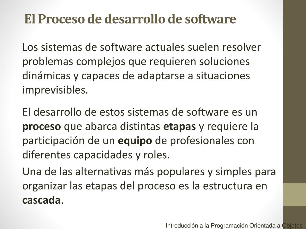 El Proceso de desarrollo de software Los sistemas de software actuales suelen resolver problemas complejos que requieren soluciones dinámicas y capaces de adaptarse a situaciones imprevisibles. El desarrollo de estos sistemas de software es un proceso que abarca distintas etapas y requiere la participación de un equipo de profesionales con diferentes capacidades y roles. Una de las alternativas más populares y simples para organizar las etapas del proceso es la estructura en cascada. Introducción a la Programación Orientada a Objetos