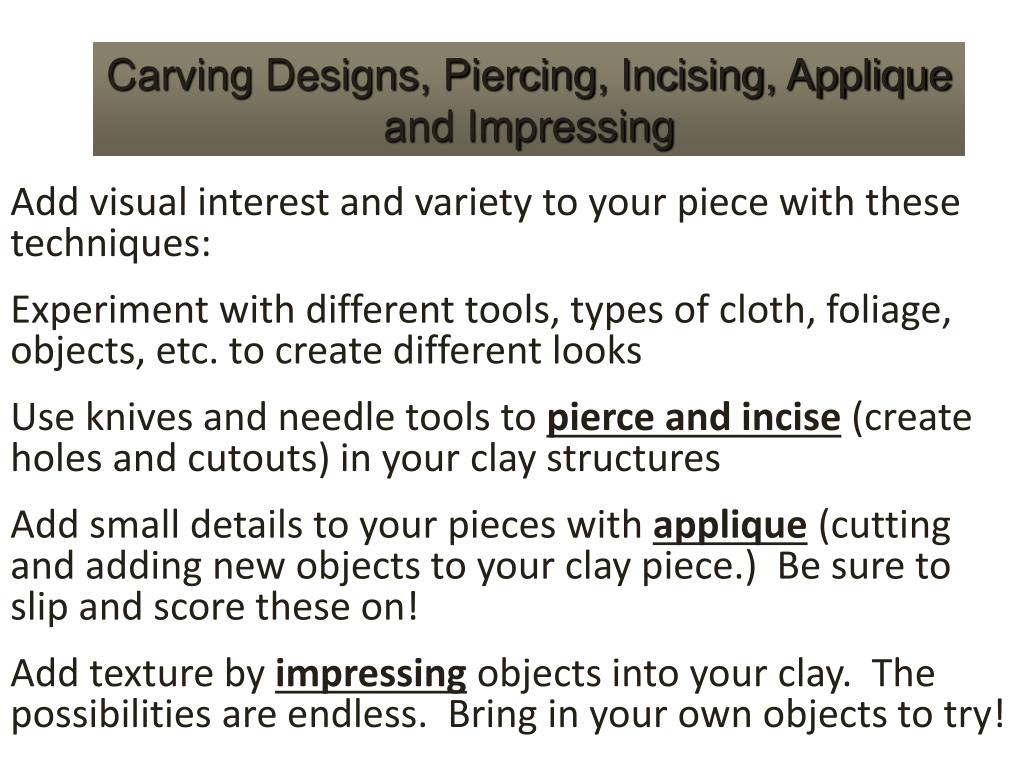 Carving Designs, Piercing, Incising, Applique and Impressing Add visual interest and variety to your piece with these techniques: Experiment with different tools, types of cloth, foliage, objects, etc. to create different looks Use knives and needle tools to pierce and incise (create holes and cutouts) in your clay structures Add small details to your pieces with applique(cutting and adding new objects to your clay piece.) Be sure to slip and score these on! Add texture by impressing objects into your clay. The possibilities are endless. Bring in your own objects to try!