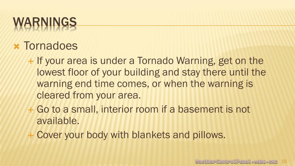 Tornadoes • If your area is under a Tornado Warning, get on the lowest floor of your building and stay there until the warning end time comes, or when the warning is cleared from your area. • Go to a small, interior room if a basement is not available. • Cover your body with blankets and pillows. Warnings