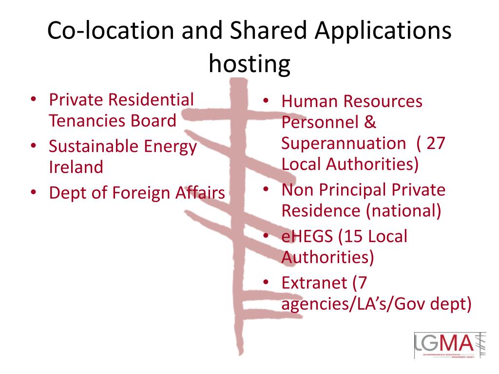 Co-location and Shared Applications hosting • Private Residential Tenancies Board • Sustainable Energy Ireland • Dept of Foreign Affairs • Human Resources Personnel & Superannuation ( 27 Local Authorities) • Non Principal Private Residence (national) • eHEGS (15 Local Authorities) • Extranet (7 agencies/LA’s/Gov dept)