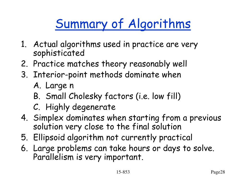 Summary of Algorithms • Actual algorithms used in practice are very sophisticated • Practice matches theory reasonably well • Interior-point methods dominate when • Large n • Small Cholesky factors (i.e. low fill) • Highly degenerate • Simplex dominates when starting from a previous solution very close to the final solution • Ellipsoid algorithm not currently practical • Large problems can take hours or days to solve. Parallelism is very important. 15-853