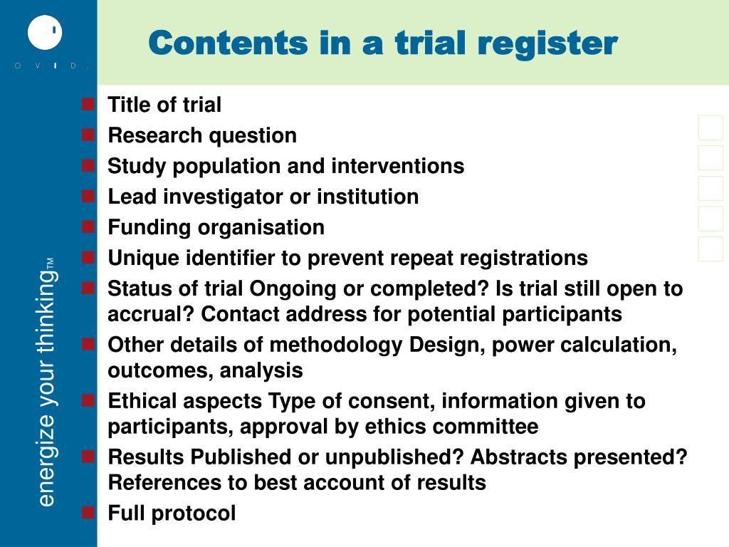 Contents in a trial register • Title of trial • Research question • Study population and interventions • Lead investigator or institution • Funding organisation • Unique identifier to prevent repeat registrations • Status of trial Ongoing or completed? Is trial still open to accrual? Contact address for potential participants • Other details of methodology Design, power calculation, outcomes, analysis • Ethical aspects Type of consent, information given to participants, approval by ethics committee • Results Published or unpublished? Abstracts presented? References to best account of results • Full protocol