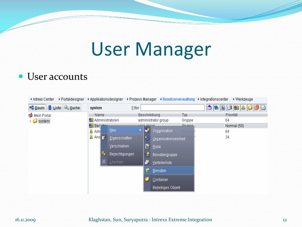 User Manager • User accounts Klaghstan, Sun, Suryaputra : Intrexx Extreme Integration