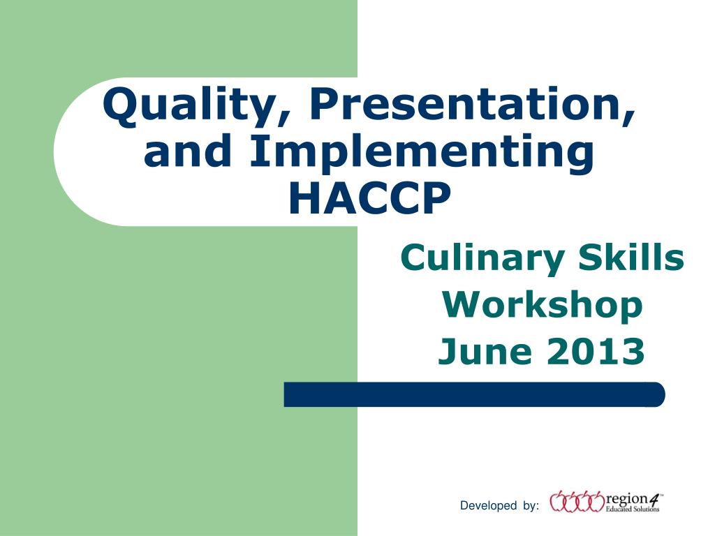 Quality, Presentation, and Implementing HACCP. Culinary Skills Workshop June 2013. Objectives. Explore quality standards in delivering fresh, appealing foods to students. Review HACCP principles and tools to document and verify your district’s HACCP plan. Objectives.
