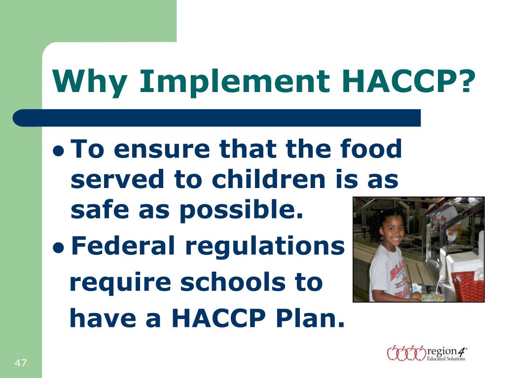 Why Implement HACCP? • To ensure that the food served to children is as safe as possible. • Federal regulations require schools to have a HACCP Plan.