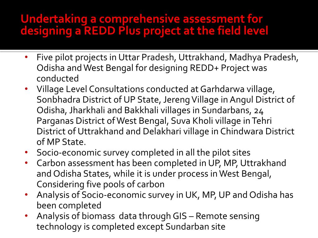 Undertaking a comprehensive assessment for designing a REDD Plus project at the field level • Five pilot projects in Uttar Pradesh, Uttrakhand, Madhya Pradesh, Odisha and West Bengal for designing REDD+ Project was conducted • Village Level Consultations conducted at Garhdarwa village, Sonbhadra District of UP State, Jereng Village in Angul District of Odisha, Jharkhali and Bakkhali villages in Sundarbans, 24 Parganas District of West Bengal, Suva Kholi village in Tehri District of Uttrakhand and Delakhari village in Chindwara District of MP State. • Socio-economic survey completed in all the pilot sites • Carbon assessment has been completed in UP, MP, Uttrakhand and Odisha States, while it is under process in West Bengal, Considering five pools of carbon • Analysis of Socio-economic survey in UK, MP, UP and Odisha has been completed • Analysis of biomass data through GIS – Remote sensing technology is completed except Sundarban site