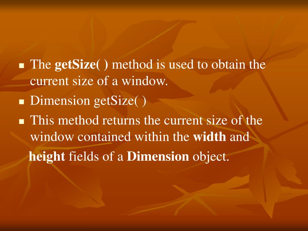 The getSize( ) method is used to obtain the current size of a window. • Dimension getSize( ) • This method returns the current size of the window contained within the width and height fields of a Dimension object.