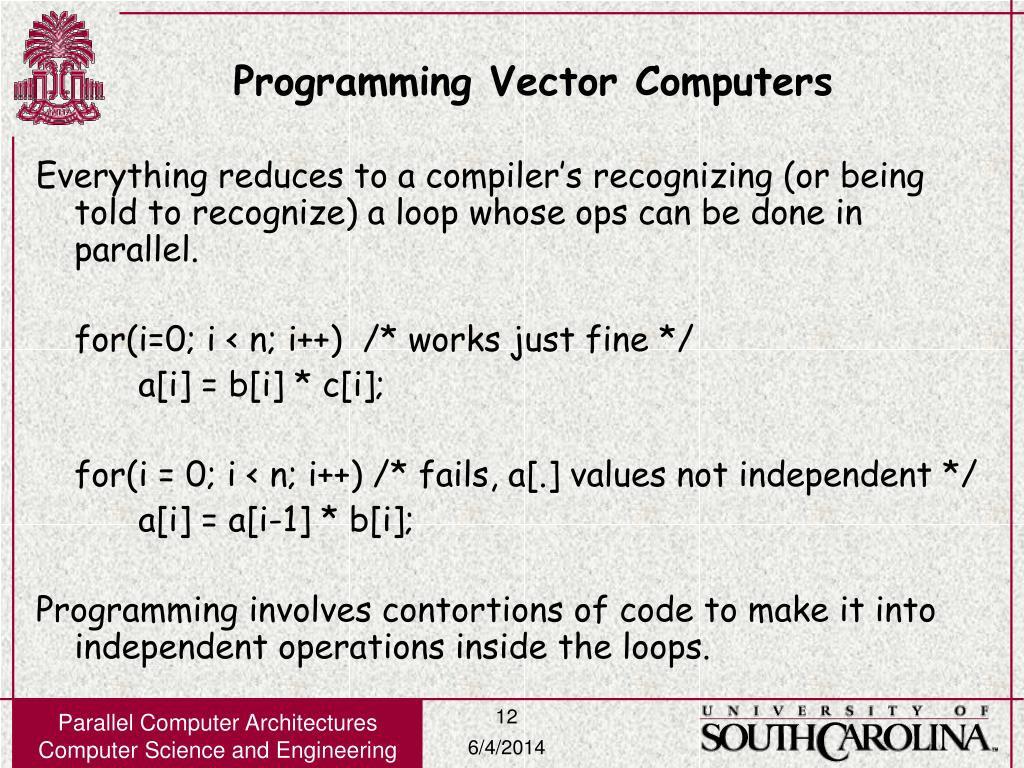 Programming Vector Computers Everything reduces to a compiler’s recognizing (or being told to recognize) a loop whose ops can be done in parallel. for(i=0; i < n; i++) /* works just fine */ a[i] = b[i] * c[i]; for(i = 0; i < n; i++) /* fails, a[.] values not independent */ a[i] = a[i-1] * b[i]; Programming involves contortions of code to make it into independent operations inside the loops. Parallel Computer Architectures Computer Science and Engineering