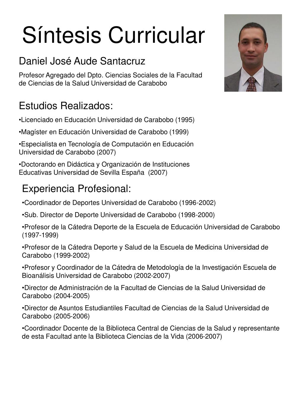 Síntesis Curricular. Daniel José Aude Santacruz Profesor Agregado del Dpto. Ciencias Sociales de la Facultad de Ciencias de la Salud Universidad de Carabobo. Estudios Realizados: Licenciado en Educación Universidad de Carabobo (1995) Magíster en Educación Universidad de Carabobo (1999)