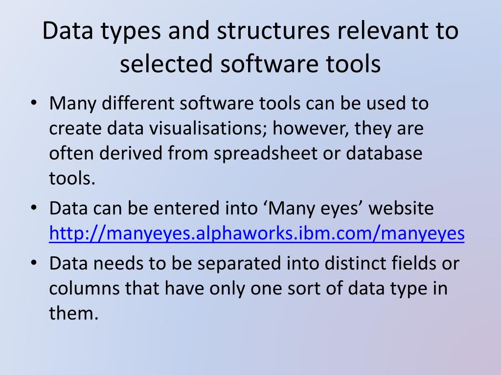 Data types and structures relevant to selected software tools • Many different software tools can be used to create data visualisations; however, they are often derived from spreadsheet or database tools. • Data can be entered into ‘Many eyes’ website http://manyeyes.alphaworks.ibm.com/manyeyes • Data needs to be separated into distinct fields or columns that have only one sort of data type in them.