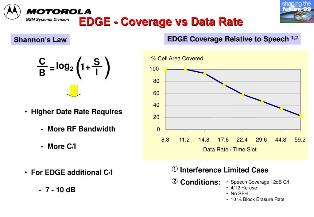 ( ) % Cell Area Covered C S log2 1+ = I B 100 80 60 40 20 Data Rate / Time Slot 0 1 Interference Limited Case 8.8 11.2 14.8 17.6 22.4 29.6 44.8 59.2 2 Conditions: • Speech Coverage 12dB C/I • 4/12 Re-use • No SFH • 10 % Block Erasure Rate EDGE - Coverage vs Data Rate EDGE Coverage Relative to Speech 1,2 Shannon’s Law • Higher Date Rate Requires • - More RF Bandwidth • - More C/I • For EDGE additional C/I • - 7 - 10 dB