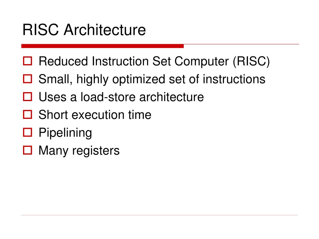 RISC Architecture • Reduced Instruction Set Computer (RISC) • Small, highly optimized set of instructions • Uses a load-store architecture • Short execution time • Pipelining • Many registers