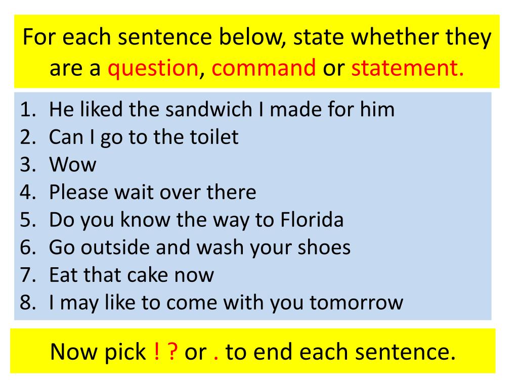 For each sentence below, state whether they are a question, command or statement. He liked the sandwich I made for him Can I go to the toilet Wow Please wait over there Do you know the way to Florida Go outside and wash your shoes Eat that cake now I may like to come with you tomorrow Now pick ! ? or . to end each sentence.