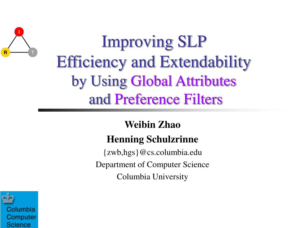 Improving SLP Efficiency and Extendability by Using Global Attributes and Preference Filters Weibin Zhao Henning Schulzrinne {zwb,hgs}@cs.columbia.edu Department of Computer Science Columbia University