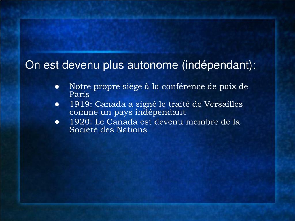 On est devenu plus autonome (indépendant): • Notre propresiègeà la conférence de paix de Paris • 1919: Canada a signé le traité de Versailles comme un pays indépendant • 1920: Le Canada estdevenumembre de la Société des Nations