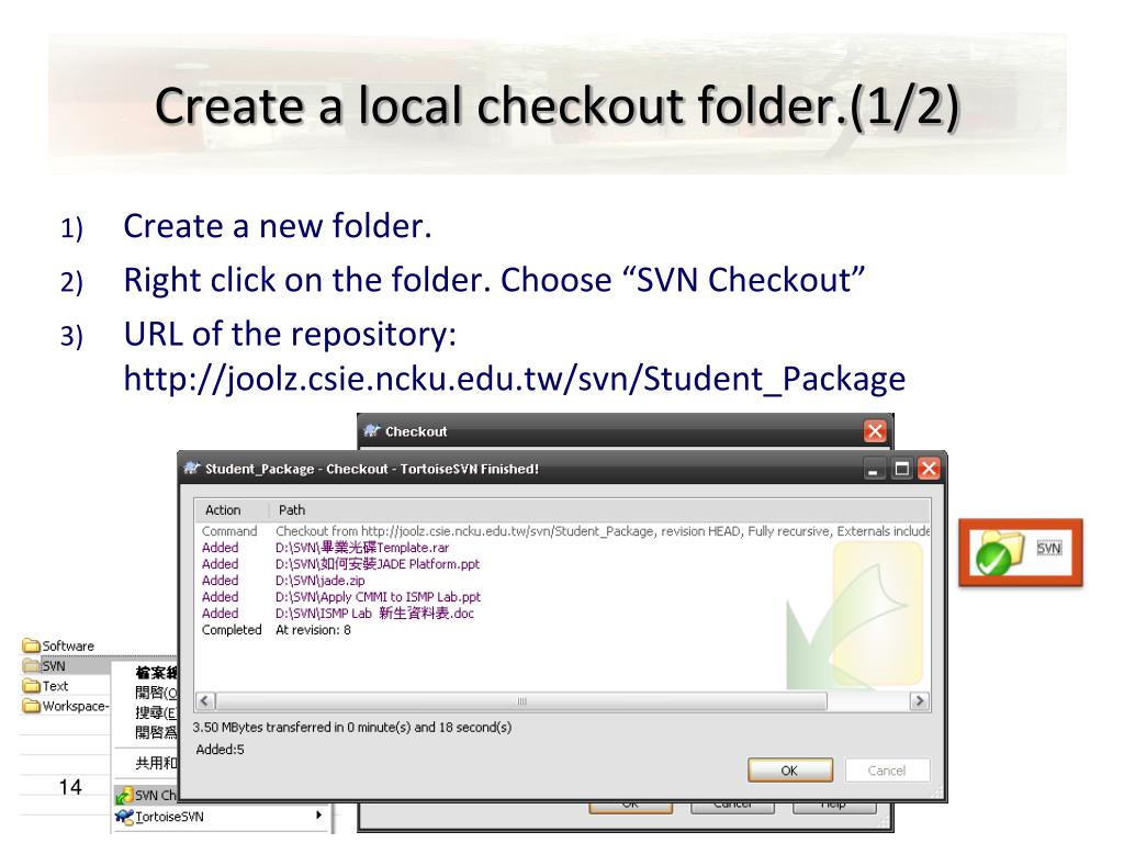 Create a local checkout folder.(1/2) • Create a new folder. • Right click on the folder. Choose “SVN Checkout” • URL of the repository: http://joolz.csie.ncku.edu.tw/svn/Student_Package