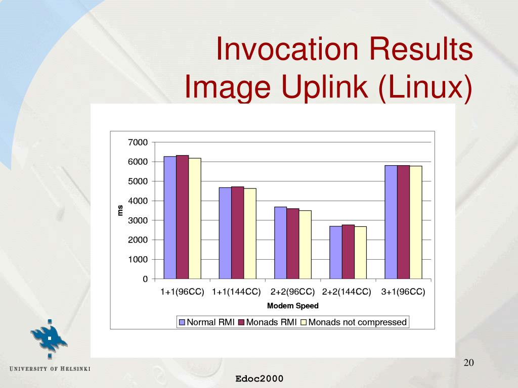 Test Arrangements • Java Virtual Machine • Sun JDK 1.2.2 (Linux and Windows) • Wireless communication • GSM HSCSD (5 configurations) • Benchmark Suite • KaRMI from University of Karlsruhe Edoc2000