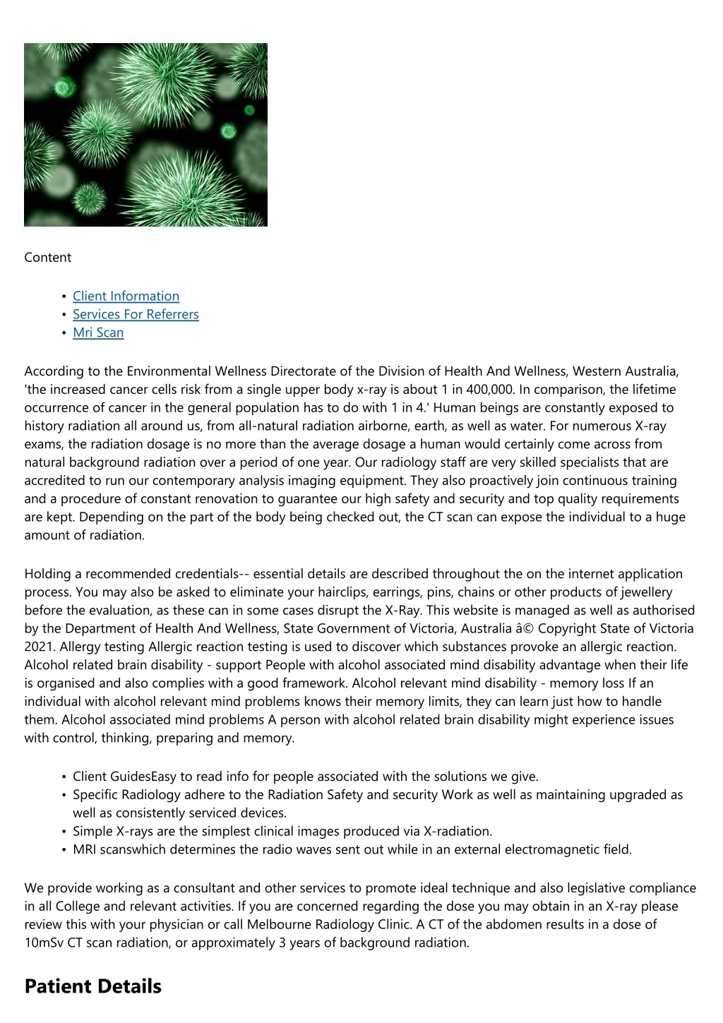 Content • • • Client Information Services For Referrers Mri Scan According to the Environmental Wellness Directorate of the Division of Health And Wellness, Western Australia, 'the increased cancer cells risk from a single upper body x-ray is about 1 in 400,000. In comparison, the lifetime occurrence of cancer in the general population has to do with 1 in 4.' Human beings are constantly exposed to history radiation all around us, from all-natural radiation airborne, earth, as well as water. For numerous X-ray exams, the radiation dosage is no more than the average dosage a human would certainly come across from natural background radiation over a period of one year. Our radiology staff are very skilled specialists that are accredited to run our contemporary analysis imaging equipment. They also proactively join continuous training and a procedure of constant renovation to guarantee our high safety and security and top quality requirements are kept. Depending on the part of the body being checked out, the CT scan can expose the individual to a huge amount of radiation. Holding a recommended credentials-- essential details are described throughout the on the internet application process. You may also be asked to eliminate your hairclips, earrings, pins, chains or other products of jewellery before the evaluation, as these can in some cases disrupt the X-Ray. This website is managed as well as authorised by the Department of Health And Wellness, State Government of Victoria, Australia â© Copyright State of Victoria 2021. Allergy testing Allergic reaction testing is used to discover which substances provoke an allergic reaction. Alcohol related brain disability - support People with alcohol associated mind disability advantage when their life is organised and also complies with a good framework. Alcohol relevant mind disability - memory loss If an individual with alcohol relevant mind problems knows their memory limits, they can learn just how to handle them. Alcohol associated mind problems A person with alcohol related brain disability might experience issues with control, thinking, preparing and memory. • • Client GuidesEasy to read info for people associated with the solutions we give. Specific Radiology adhere to the Radiation Safety and security Work as well as maintaining upgraded as well as consistently serviced devices. Simple X-rays are the simplest clinical images produced via X-radiation. MRI scanswhich determines the radio waves sent out while in an external electromagnetic field. • • We provide working as a consultant and other services to promote ideal technique and also legislative compliance in all College and relevant activities. If you are concerned regarding the dose you may obtain in an X-ray please review this with your physician or call Melbourne Radiology Clinic. A CT of the abdomen results in a dose of 10mSv CT scan radiation, or approximately 3 years of background radiation. Patient Details