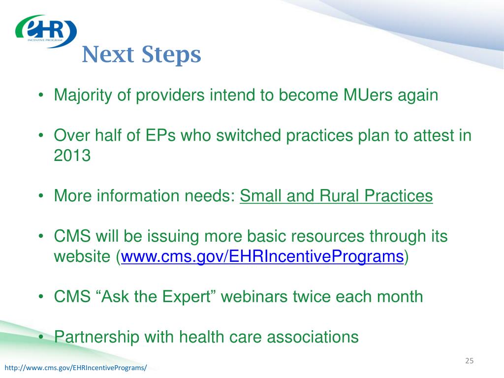 Next Steps • Majority of providers intend to become MUers again • Over half of EPs who switched practices plan to attest in 2013 • More information needs: Small and Rural Practices • CMS will be issuing more basic resources through its website (www.cms.gov/EHRIncentivePrograms) • CMS “Ask the Expert” webinars twice each month • Partnership with health care associations