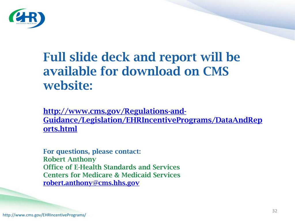 Full slide deck and report will be available for download on CMS website:http://www.cms.gov/Regulations-and-Guidance/Legislation/EHRIncentivePrograms/DataAndReports.htmlFor questions, please contact:Robert AnthonyOffice of E-Health Standards and ServicesCenters for Medicare & Medicaid Servicesrobert.anthony@cms.hhs.gov