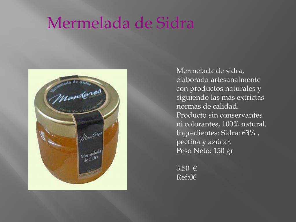 Mermelada de Sidra Mermelada de sidra, elaborada artesanalmente con productos naturales y siguiendo las más extrictas normas de calidad.Producto sin conservantes ni colorantes, 100% natural.Ingredientes: Sidra: 63% , pectina y azúcar.Peso Neto: 150 gr 3.50 € Ref:06