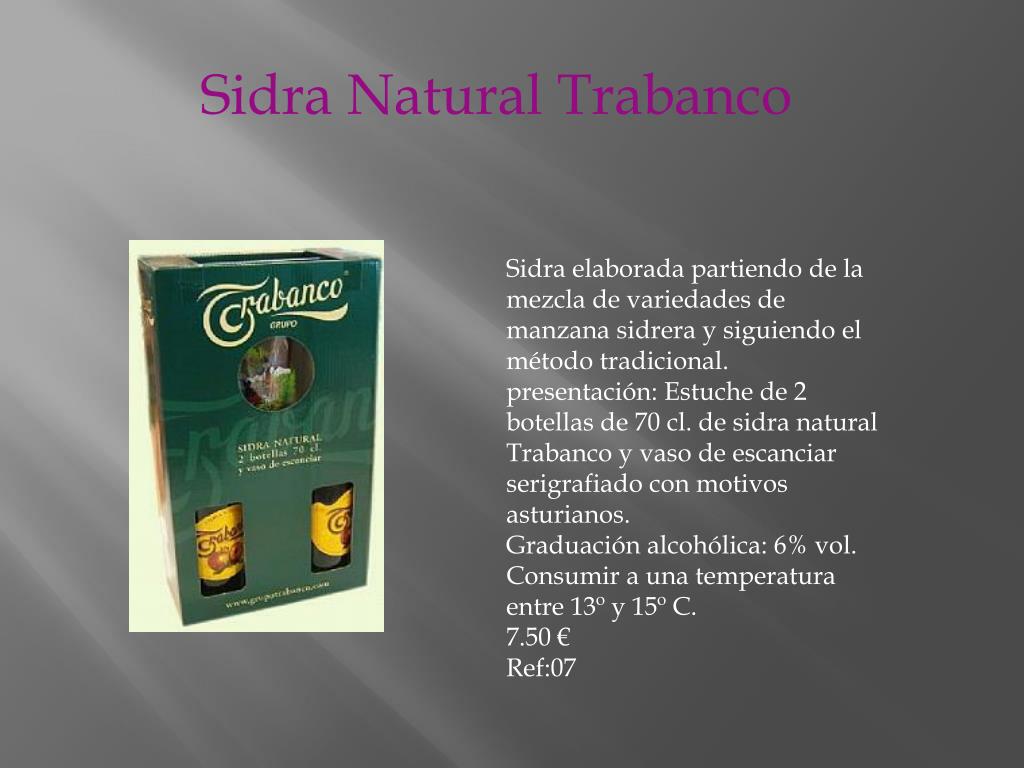 Sidra Natural Trabanco Sidra elaborada partiendo de la mezcla de variedades de manzana sidrera y siguiendo el método tradicional. presentación: Estuche de 2 botellas de 70 cl. de sidra natural Trabanco y vaso de escanciar serigrafiado con motivos asturianos.Graduación alcohólica: 6% vol.Consumir a una temperatura entre 13º y 15º C. 7.50 € Ref:07