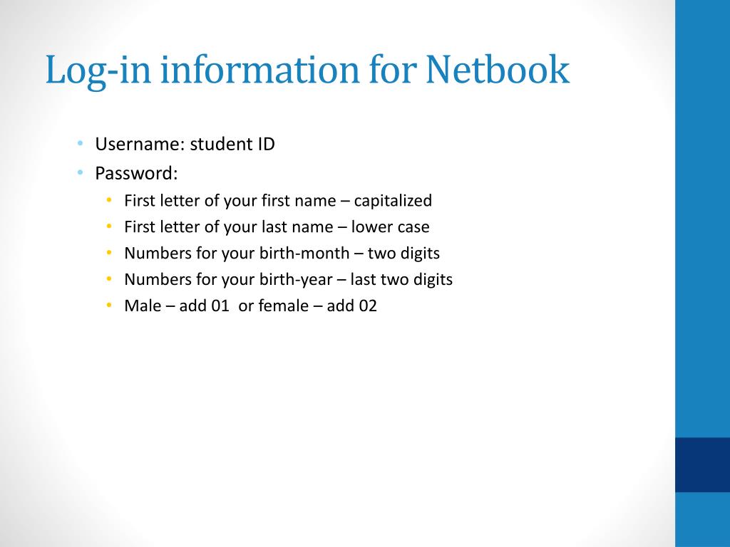 Log-in information for Netbook • Username: student ID • Password: • First letter of your first name – capitalized • First letter of your last name – lower case • Numbers for your birth-month – two digits • Numbers for your birth-year – last two digits • Male – add 01 or female – add 02