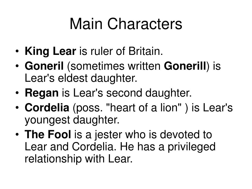 Main Characters • King Lear is ruler of Britain. • Goneril (sometimes written Gonerill) is Lear's eldest daughter. • Regan is Lear's second daughter. • Cordelia (poss. "heart of a lion" ) is Lear's youngest daughter. • The Fool is a jester who is devoted to Lear and Cordelia. He has a privileged relationship with Lear.