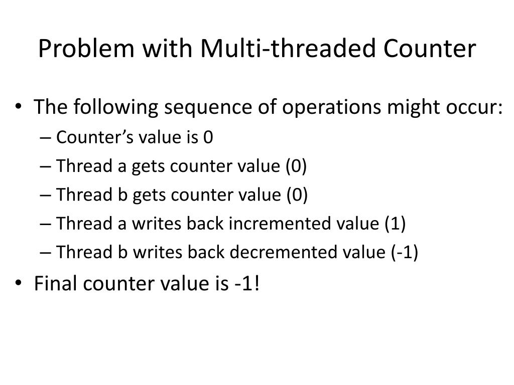 Problem with Multi-threaded Counter • The following sequence of operations might occur: • Counter’s value is 0 • Thread a gets counter value (0) • Thread b gets counter value (0) • Thread a writes back incremented value (1) • Thread b writes back decremented value (-1) • Final counter value is -1!