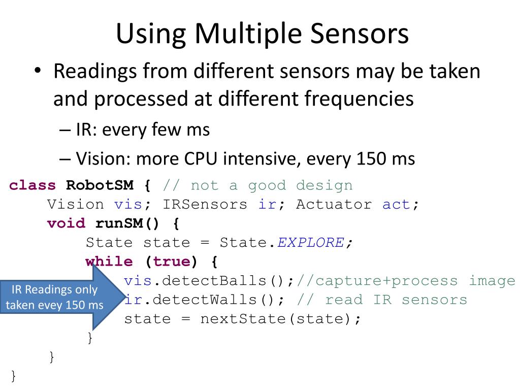 Using Multiple Sensors • Readings from different sensors may be taken and processed at different frequencies • IR: every few ms • Vision: more CPU intensive, every 150 ms classRobotSM{ // not a good design Vision vis; IRSensorsir; Actuator act; voidrunSM() { State state = State.EXPLORE; while (true) { vis.detectBalls();//capture+process image ir.detectWalls();// read IR sensors state = nextState(state); } } } IR Readings only taken evey 150 ms