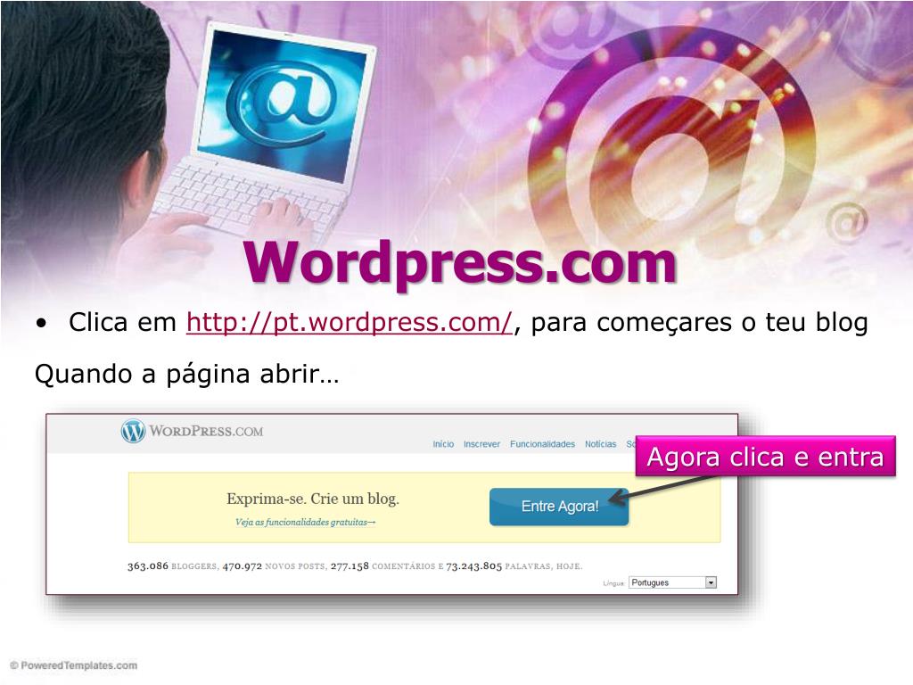 Wordpress.com • Clicaemhttp://pt.wordpress.com/, para começares o teu blog Quando a página abrir… Agora clica e entra